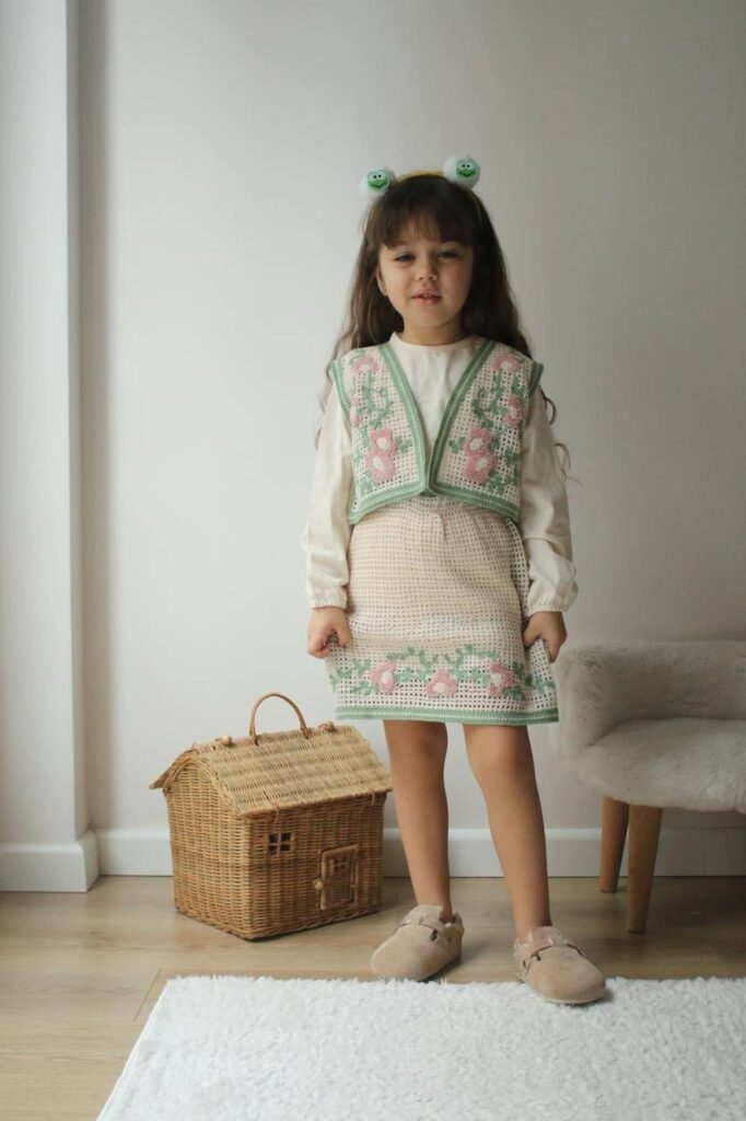 Çiçek İşleme Örme Yelek Etek Üçlü Takım