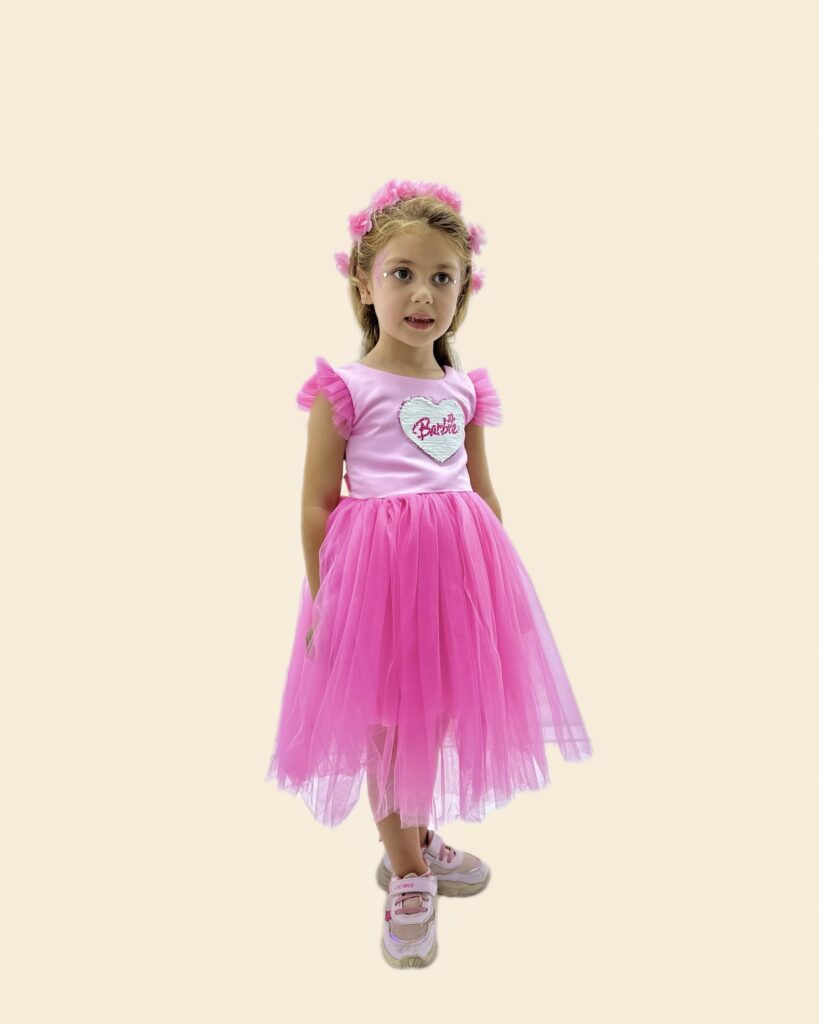 Barbie Baskı Pembe Tüllü Abiye Elbise